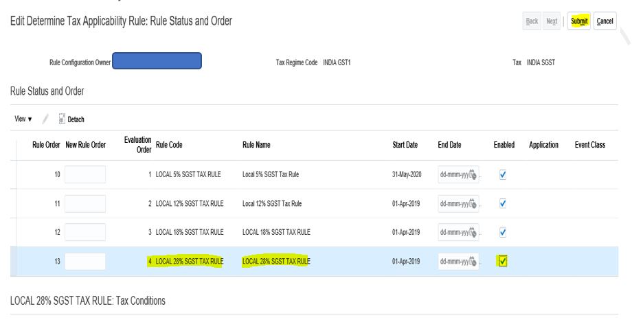 Creating Tax Rule for Tax Classification Code ‘Local 28%’ under SGST Tax.